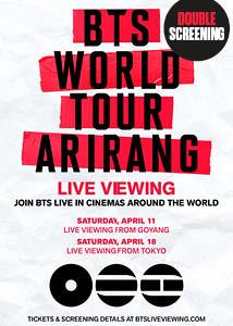 |   | BTS WORLD TOUR ‘ARIRANG’ IN GOYANG: LIVE VIEWING, lørdag den 11/4-2026, kl 11:30, Sal 1 - Den Største Billet til "BTS WORLD TOUR ‘ARIRANG’ IN GOYANG: LIVE VIEWING", Lørdag den 11/4-2026 klokken 11:30. Slutter ca 14:45. Vises i "Sal 1 - Den Største". |